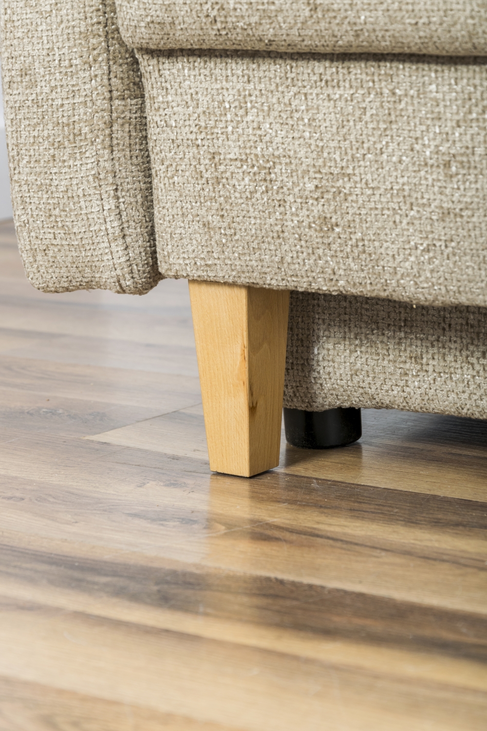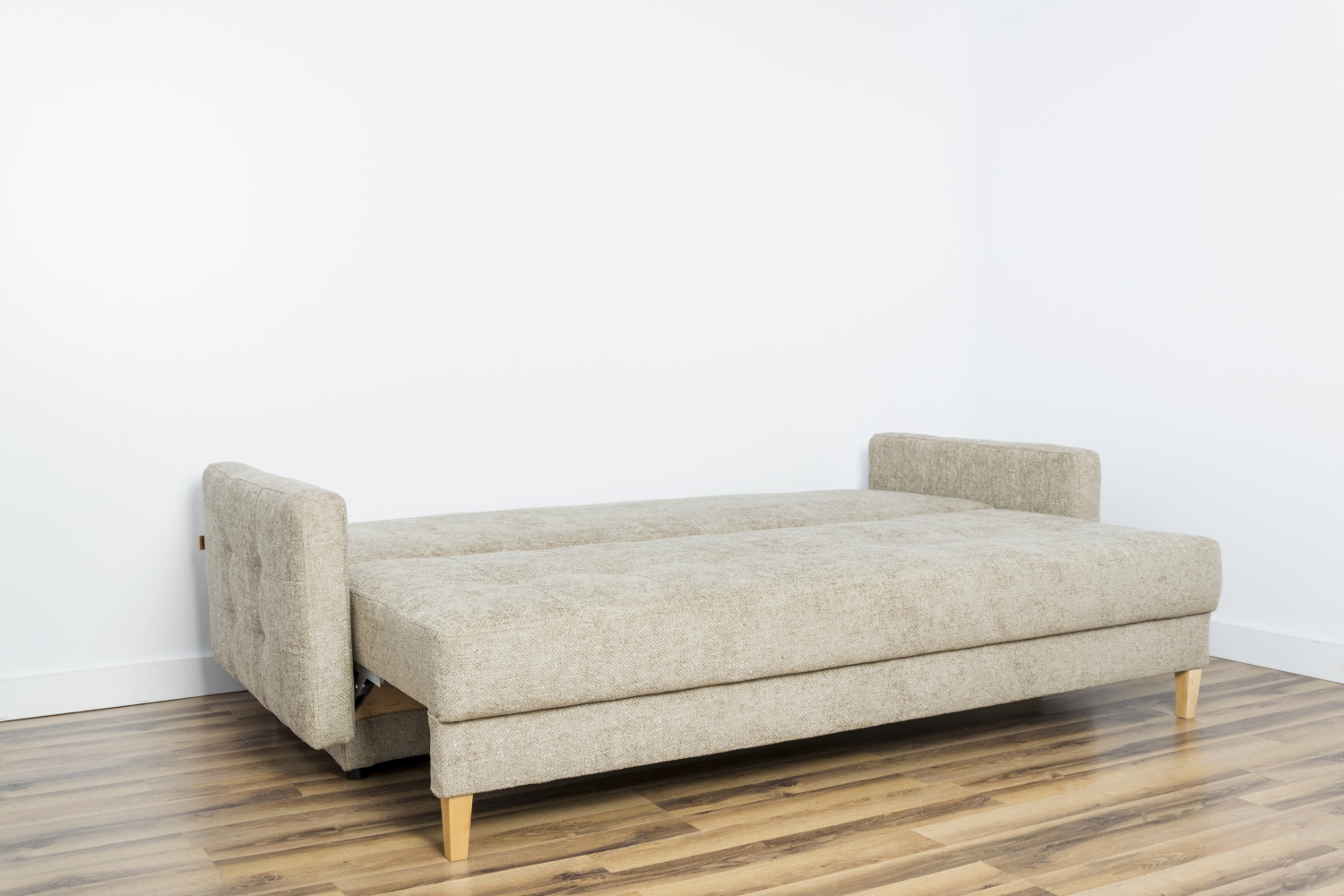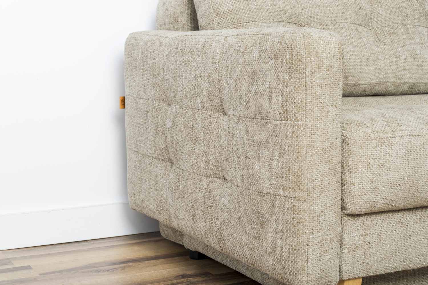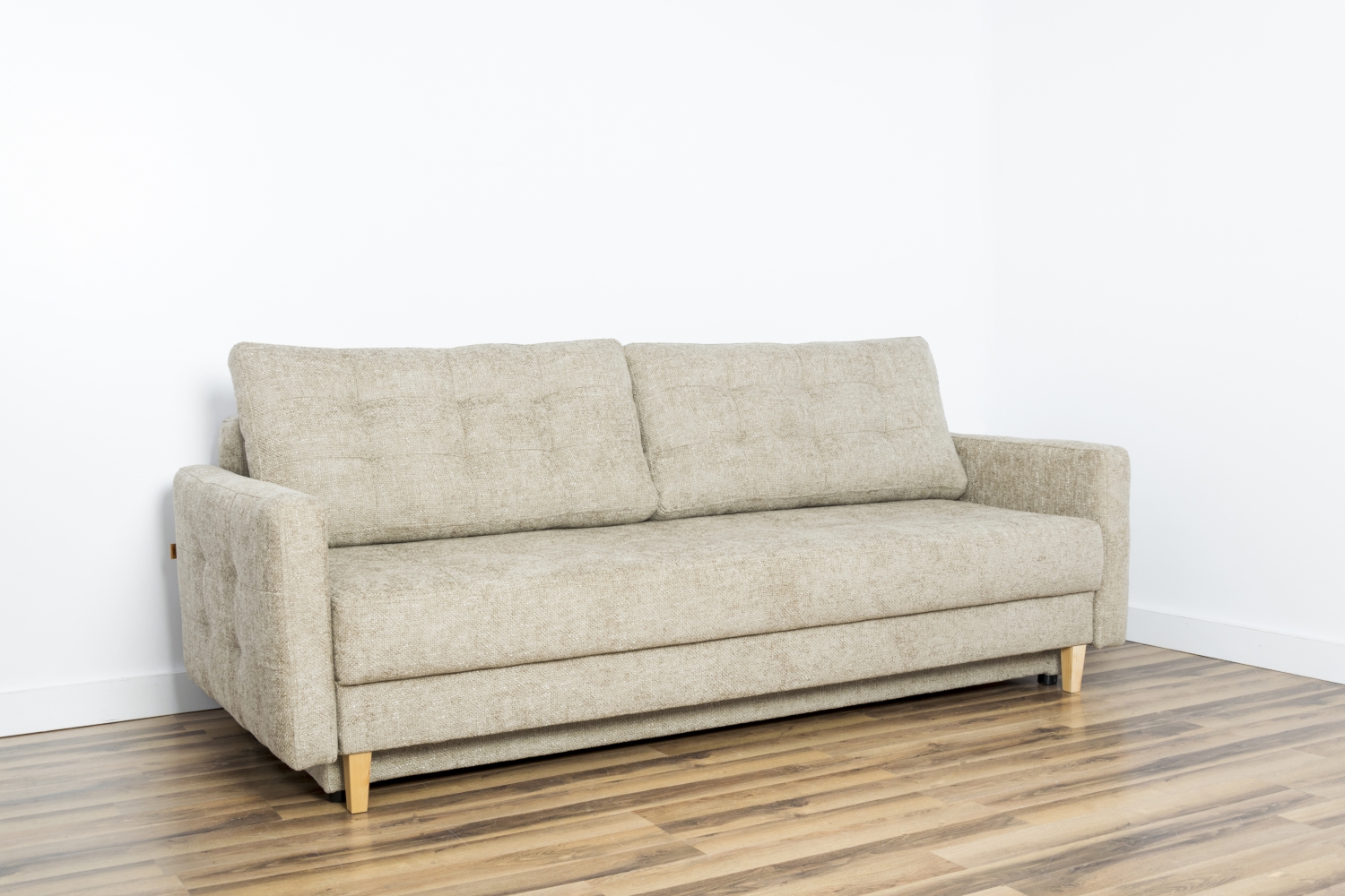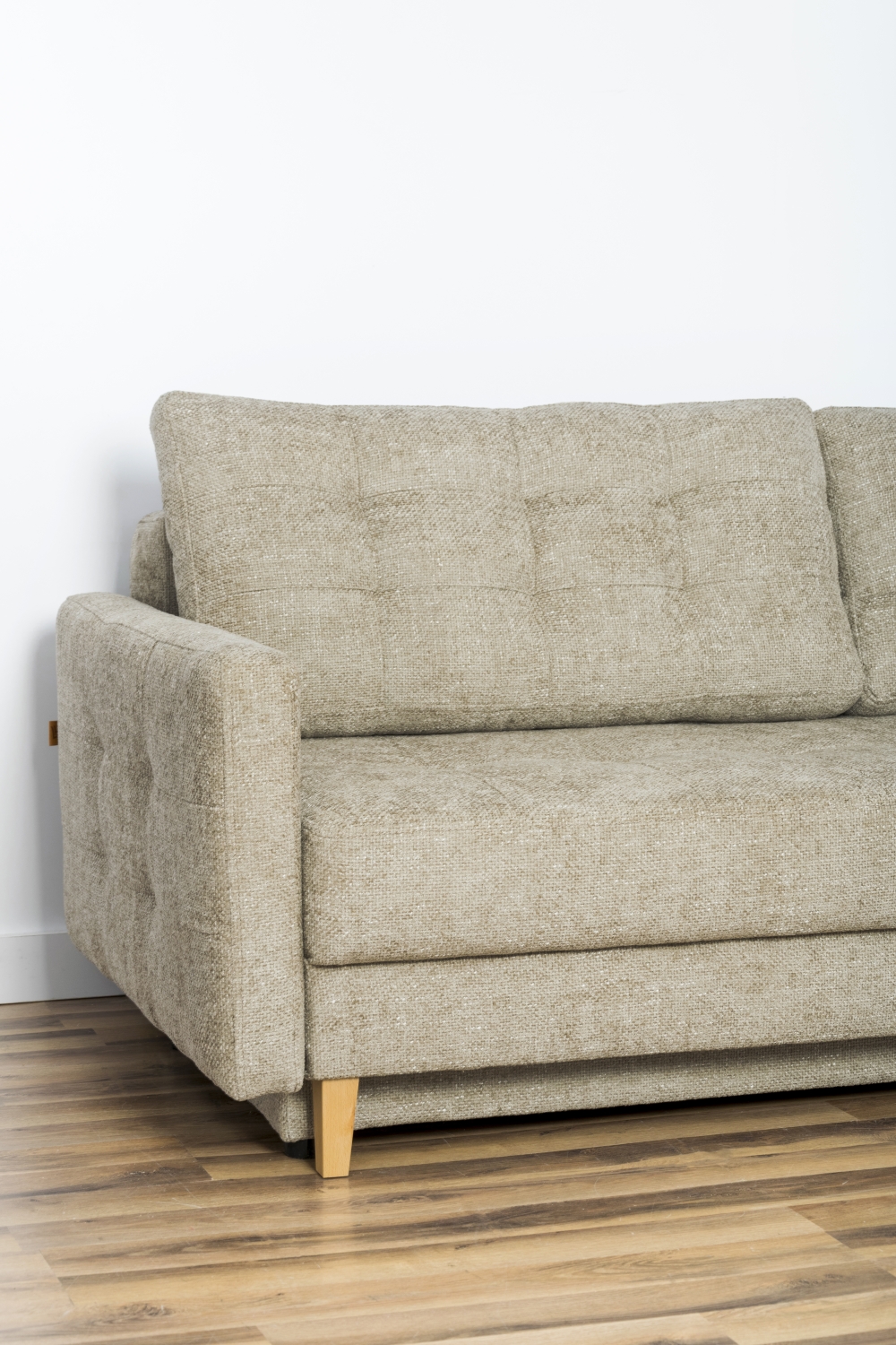 Kanapa Moreno jest to mebel na konstrukcji tak zwanej DL. Gdy uniesiemy siedzisko będziemy mieli dostęp do pojemnika na pościel , natomiast gdy położymy oparcie uzyskamy powierzchnię do spania. Całość wykonana jest z wysokiej jakości materiałów, ramie drewnianej, sprężynie typu bonel. Na oparciu są dwie luźne poduchy przepikowane, całość stoi na nóżkach drewnianych. Dodatkowo jest to kanapa z bokami, a boki jak i siedzisko również są przepikowane.