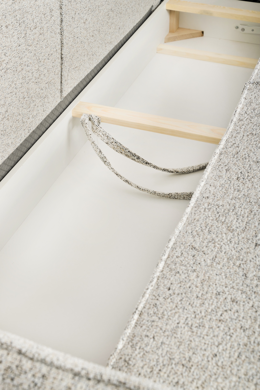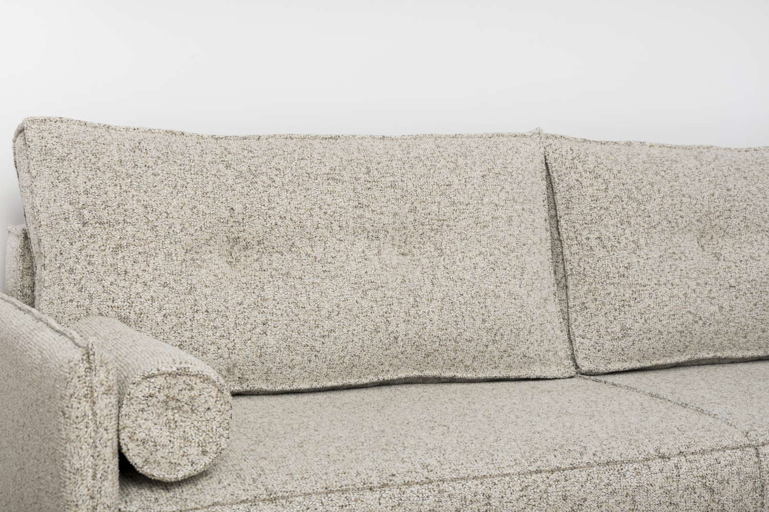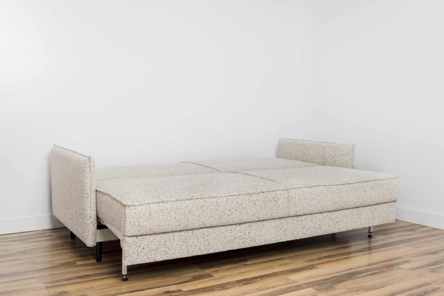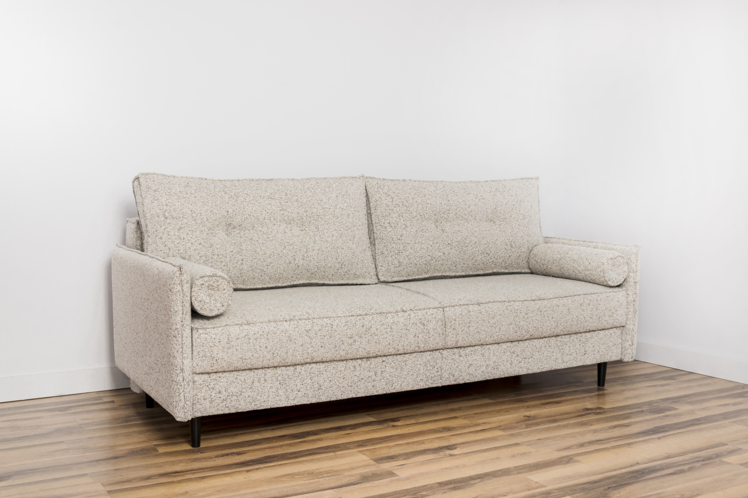 Kanapa Pati to mebel o prostym eleganckim kształcie. Każda część kanapy jest szyta tzw. szwem francuskim co można zobaczyć w poniższej galerii. Kanapa wykonana jest na sprężynie typu bonell. Na oparciu znajdują się dwie przepikowane poduchy oraz poduszki w formie wałków. Mamy tutaj również funkcję spania oraz pojemnik na pościel. Cała kanapa stoi na czterech wysokich drewnianych nogach.