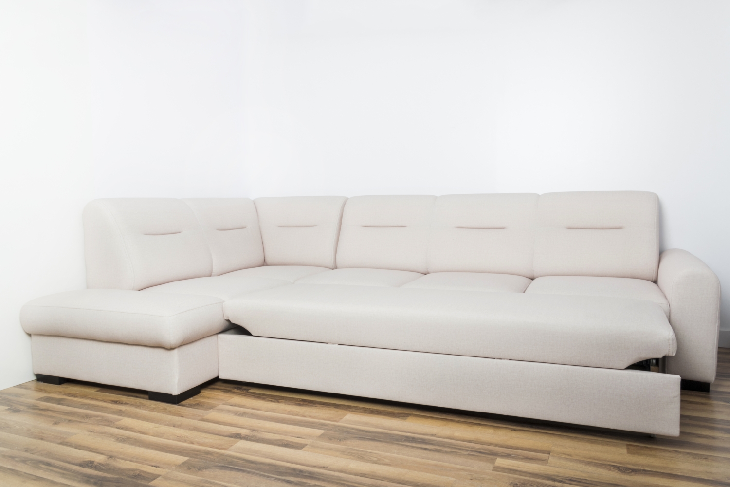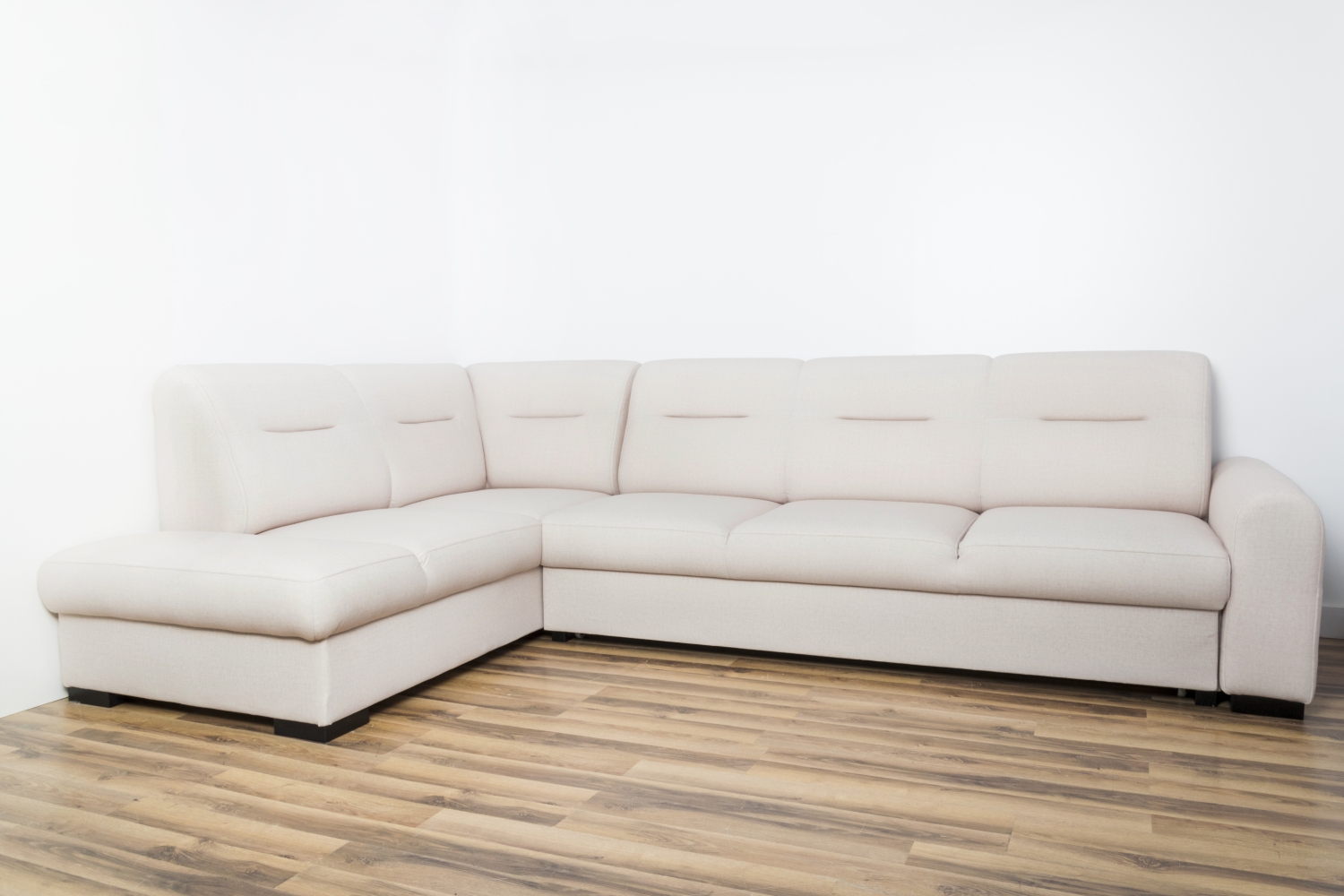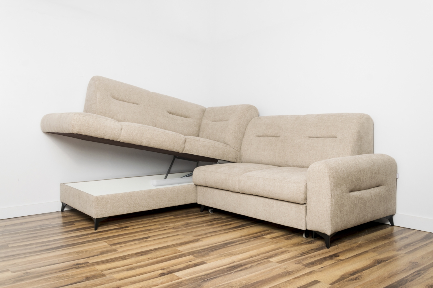 Narożnik Bergamo jest to zestaw modułowy co oznacza, że możemy dowolnie go konfigurować i łączyć poszczególne elementy na wymiar jaki nam odpowiada. Jego prosty fason z obłymi kształtami na przodzie siedziska jak i na oparciu sprawia, że posiadamy delikatny prosty wzór, a zarazem elegancki. Na oparciu zostały wykonane pozione wciągnięcia. Cały narożik stoi na wysokich metalowych nogach. Oczywiście znajdziemy tutaj funcję spania oraz pojemnik na pościel. Do produkcji używane są wysokiej jakości materiały. Stelaż wykonany jest z drewna, natomiast wypełnienie to pianka wysokoelastyczna HR oraz sprężyny faliste.